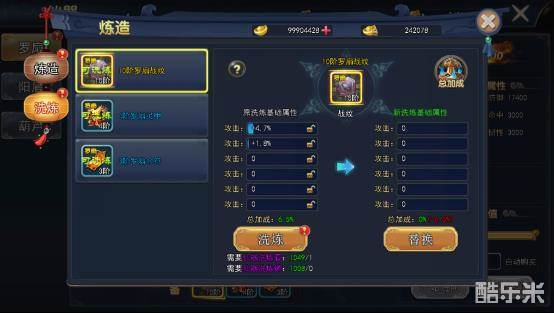 仙器洗炼,仙器装备可消耗仙器洗炼石进行洗炼,洗炼可获得一条或多条仙器装备基础属性加成,洗炼次数越多,越有可能获得高级条目,假如对洗炼结果满意,点击替换可以将洗炼结果进行保存,如选择不替换,洗炼结果会在下次洗炼中丢失,对某个条目使用仙器洗炼锁可以使该条目在下次洗炼中保持不变。