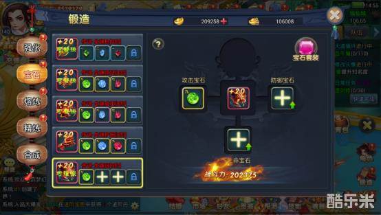 在这里可以对装备进行宝石的镶嵌,每个装备可以镶嵌是三种宝石,分别是攻击,防御和是生命,另外,在全套装备强化到+15的时候,可以开启神级增益宝石孔。在每个装备对应的宝石槽镶嵌宝石就可以提升战斗力了,宝石最高为9级,用高级宝石替换低级宝石的时候,不用担心宝石会消失掉,被替换出来的宝石可以用于合成或者再次镶嵌到装备上,每四个同等级的宝石可以合成一个高一级的宝石(如4个四级合成为1个五级)。