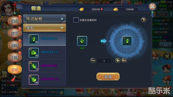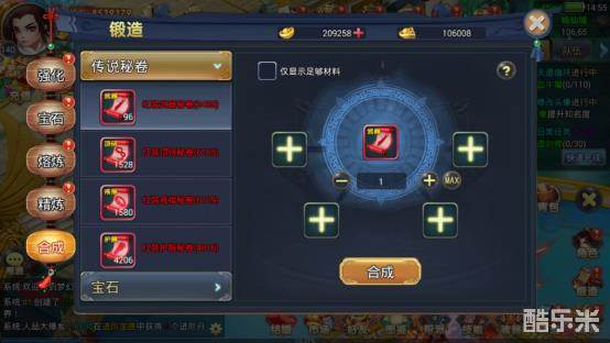 在这里可以进行传说秘卷(各种红装秘卷)和宝石的合成,宝石是用于锻造的镶嵌宝石和提升战斗力,而红装秘卷作用于游戏中的铸造系统(在铸造系统中详细讲解)。