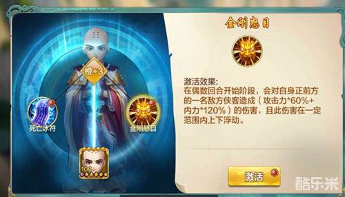 这边我是建议佩戴金刚怒目的,在字面介绍中可以看到,金刚怒目在偶数回合开始的阶段(这边许多大侠应该会感到疑问,偶数是什么意思其实就是双数啦~)可以对逍遥僧正前方的侠客造成一定比例的伤害,既然是偶数的话,那么就代表每2个回合就可以触发一次呢,也是给自身的伤害量增加了一定的比例哈~