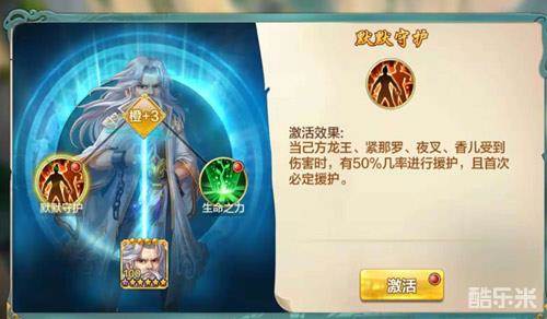 (1)【默默守护】:当己方龙王、紧那罗、夜叉、香儿受到伤害时,有50%几率进行援护,且首次必定援护。