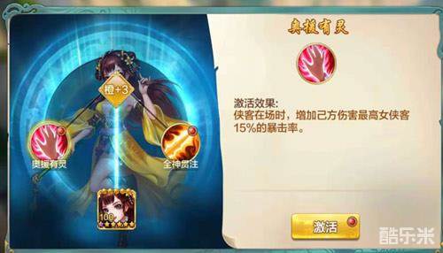 (1)【奥援有灵】:侠客在场时,增加己方伤害最高女侠客15%的暴击率。