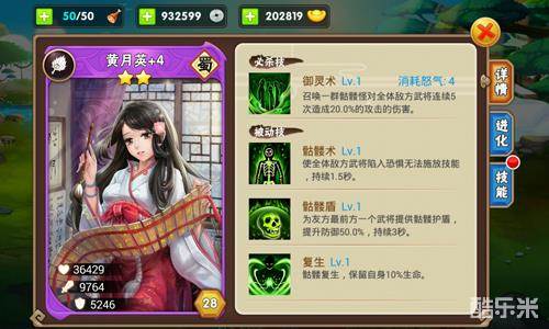 黄月英的必杀技“御灵术”可召唤一群骷髅对全体武将连续5次造成20.0%的攻击的伤害。被动技分别为“骷髅术”(使全体敌方武将陷入恐惧无法释放技能)、“骷髅盾”(为友方最前方一个武将提供骷髅护盾,提升防御50.0%)、“复生”(骷髅复生,保留自身10%生命)。