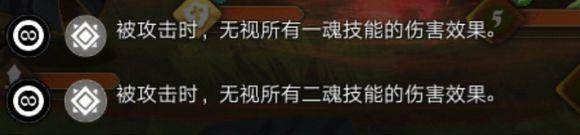 无视所有x魂技能伤害:顾名思义该类角色,不会被x魂(一般都是一二魂目前还没出现四魂)技能伤害,但这种角色很明显是可以被x魂技能之外的技能伤害的,最有代表性的就是被动,被动伤害技能是可以造成伤害的。当然不被x包括的魂芯技能都可以造成伤害,比如图一中没有四魂,故四魂技能也可以造成伤害。