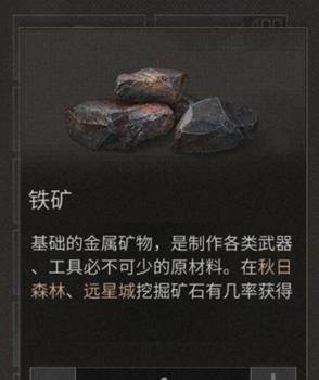 铁矿是基础金属资源,玩家制作武器或工具必须的原材料。在秋日森林、远星城挖掘矿石有几率获得。