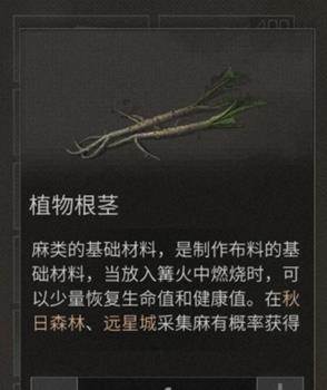 植物根茎是制作布料的基础材料,放入篝火中燃烧时,可以少量恢复生命值和健康值。在秋日森林和远星城采集麻或者藤蔓时有概率获得。