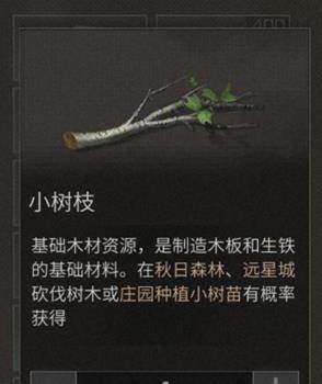 小树枝是游戏的基础材料,是制作木板和生铁的基础材料在秋日森林和远星城砍伐树木有概率获得,或者庄园种植小树苗可得。