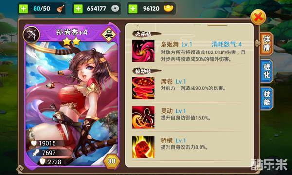 孙尚香,《三国之乱舞》中典型的攻击型女将,凭借弓兵远射程的优势,其技能秒杀范围为全屏,攻击输出较高,而且还针对步兵还会带来更高的伤害输出。
