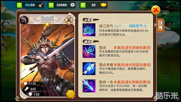 太史慈的必杀技“掠江劲弓”属于单人斩杀的终结技能,发动可以给予生命最低的敌方单体造成345%的超强伤害,并附带打断攻击效果。被动技分别为狙击(对敌方生命最低的角色造成148%的超强并打断其攻击)、弱点专精(提升自身80暴击与20%的暴击伤害)、致命一击(对生命少于25%的攻击目标,有一定几率秒杀,技能等级越高概率越高)。