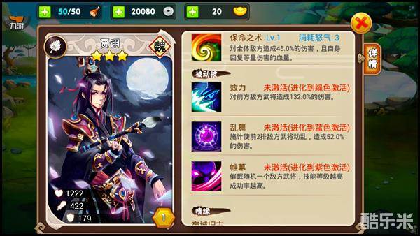 贾诩的必杀技“保命之术”恰恰印证其一生,身于乱世但求自保。属于全体伤害+回血,发动可以给予所有敌人造成45%的伤害,并回复等额的生命值。被动技分别为效力(对敌方前排造成132%伤害)、乱舞(使敌方前两排武将进入“动乱”状态,并造成52%伤害)、帷幕(随机催眠一名敌方武将,随技能等级提升而增加成功率)。
