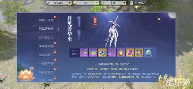 活动期间每天晚上20点至22点,“月见芳华至”活动都将准时开启、让天命者们能花费1元宝参与绝版外观的夺宝玩法!只要运气爆棚,就能在众多天命者中脱颖而出,收获当天的绝版外观及海量珍稀道具奖励!