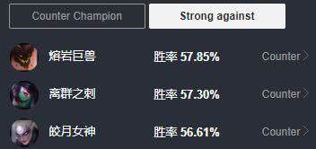 冰女是入场型英雄,主要打出余震的方式是W\R两个技能,而石头人的高控制性、高粘人性让冰女进场时必须斟酌石头人是否会开团,而阿卡丽的对线能力虽然一般,在六级以后非常灵活而且有W,冰女想要彻底控制比较难,皎月虽然不热门,但是作为Counter不错。