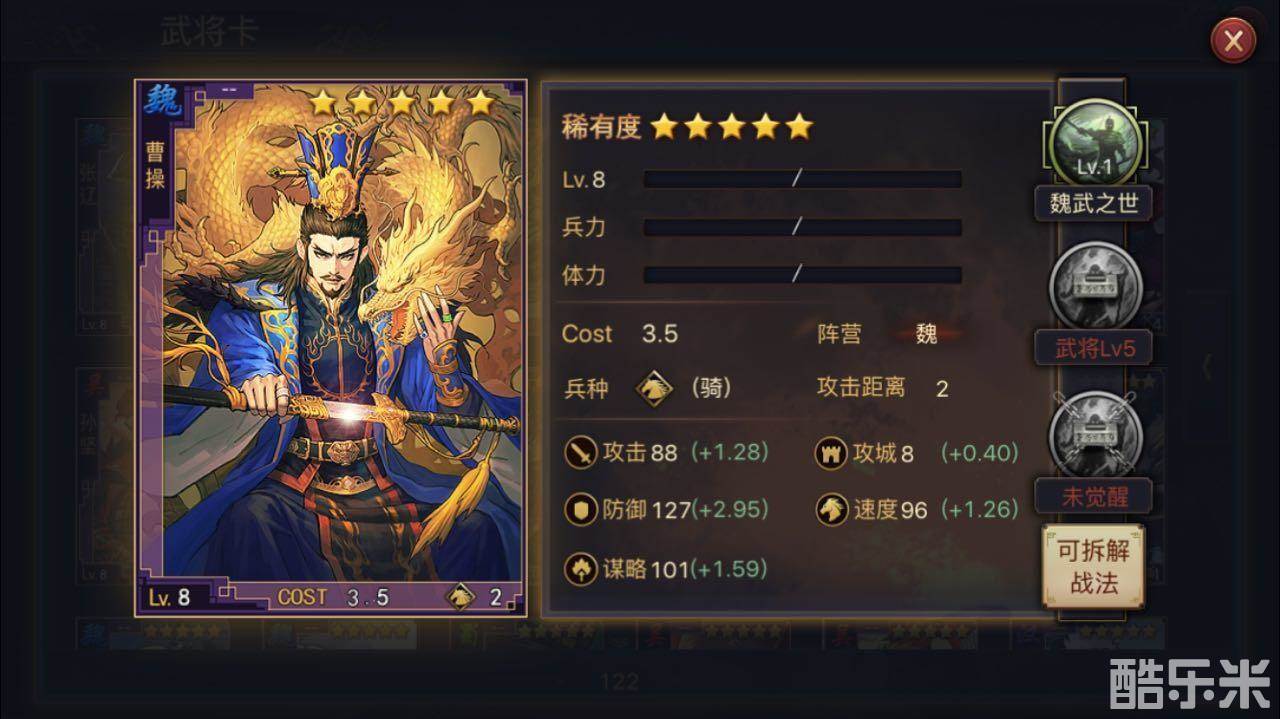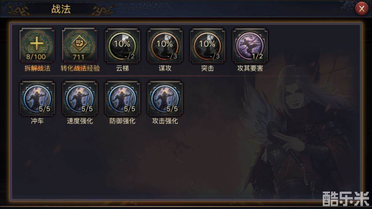 2) 第二个战法格开启:武将等级达到LV5,第二个战法格开启。以武将卡为素材拆解战法,可以获得其他武将的强力战法。