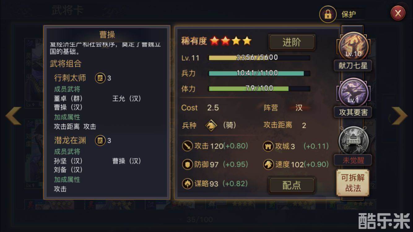 1)“潜龙在渊”组合:部队武将组合孙坚、曹操、刘备,加成“攻击”属性;