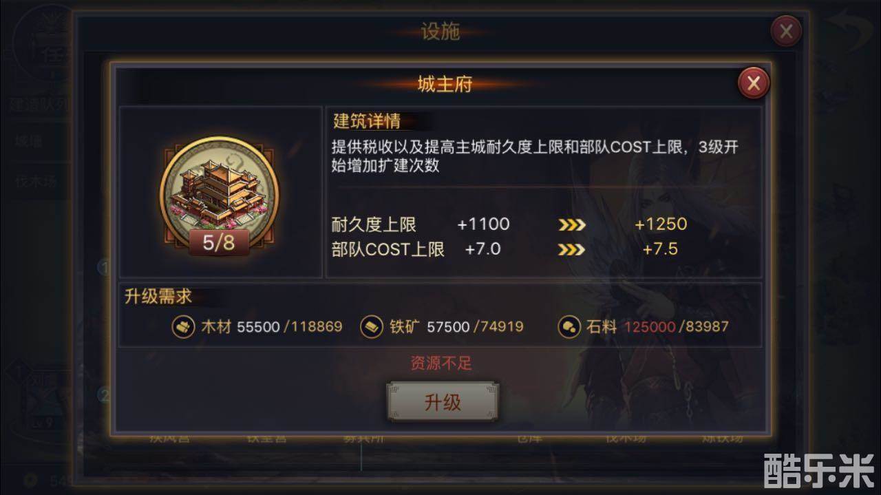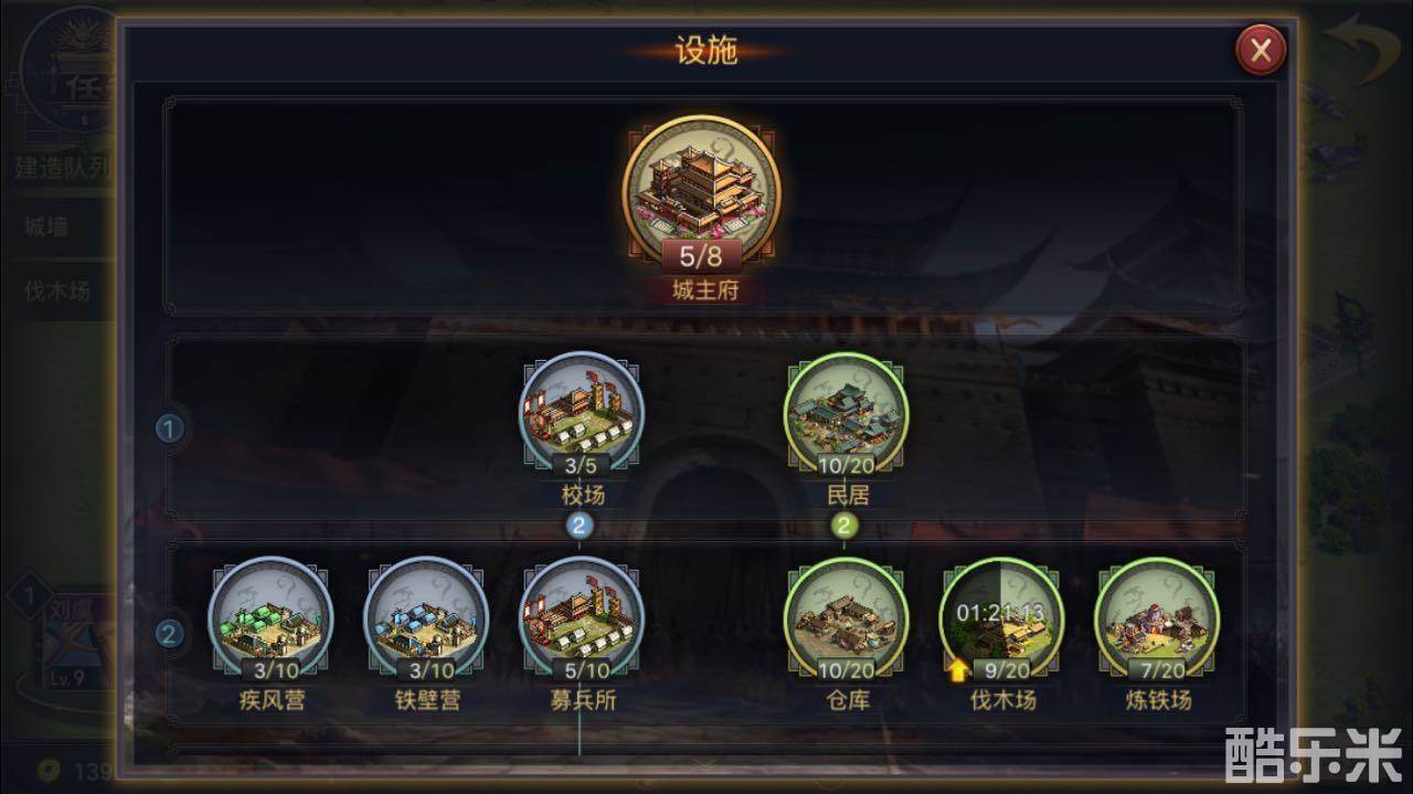 1) 城主府:提高部队COST值,部队COST值越高,部队可以配置越高级的武将,高级发展的空间更大,提升部队整体实力。