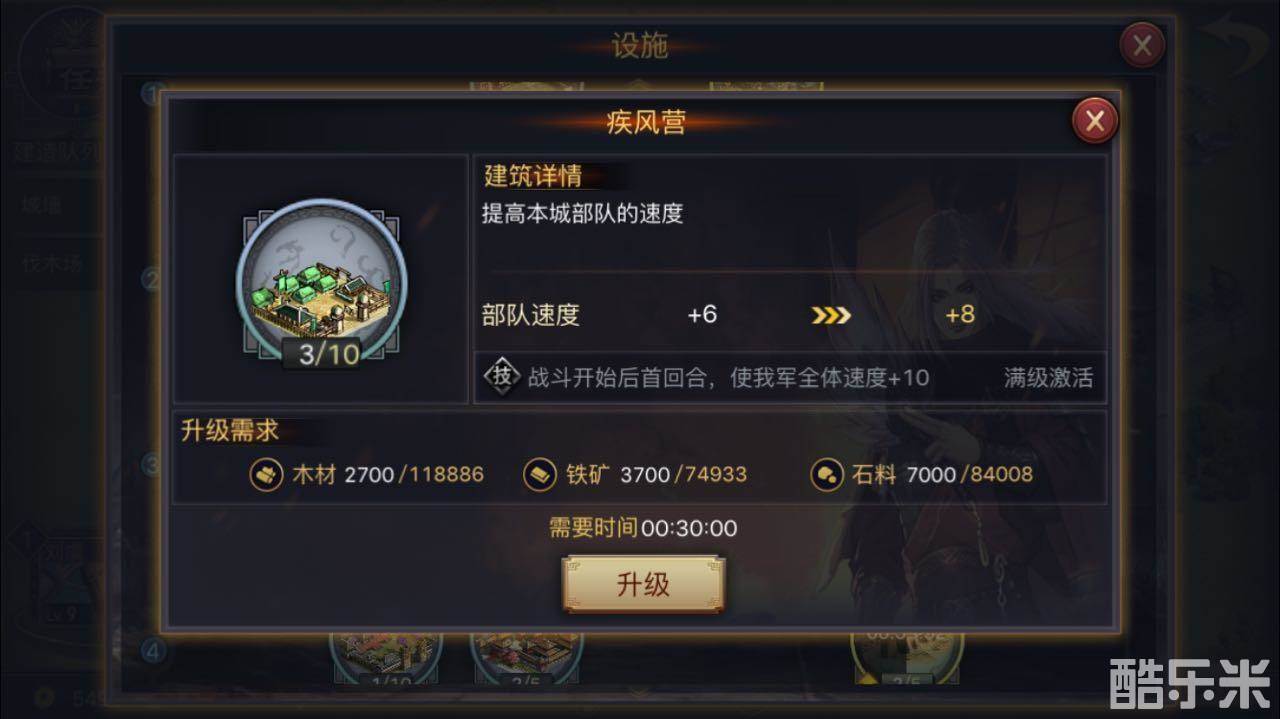 1) 疾风营:提高本城部队的速度,满级可激活战斗开始后首回合使我军全体速度+10的技能;
