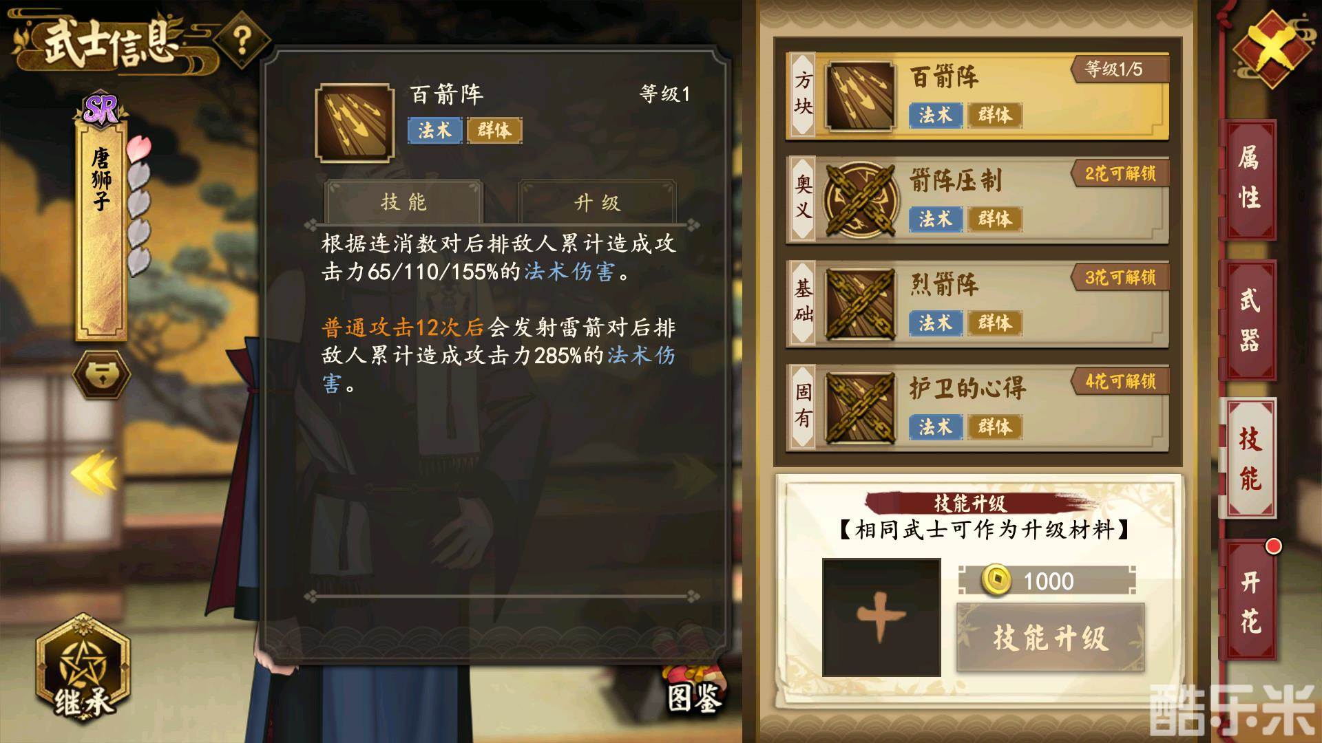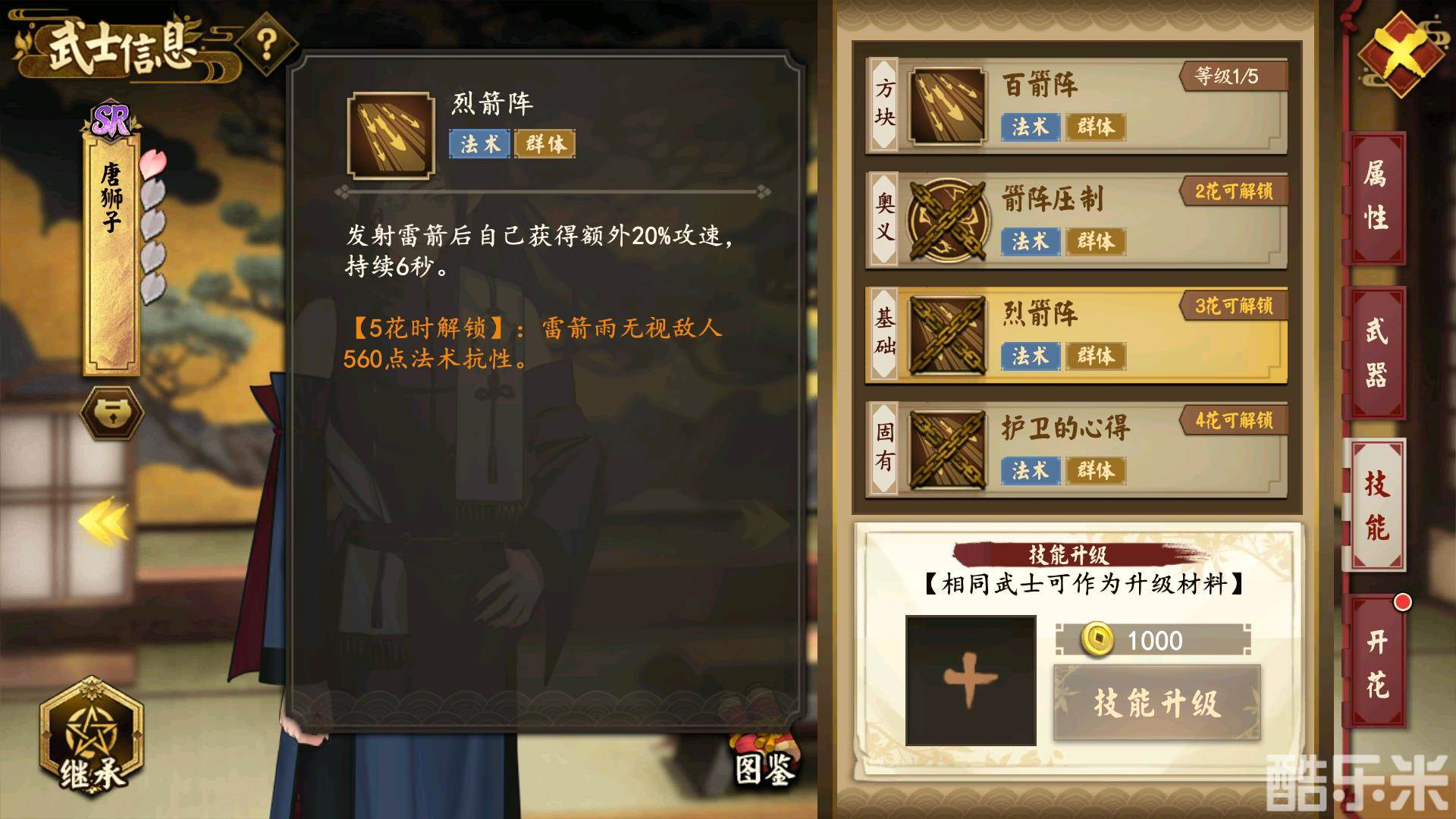 4技能是出战时候攻速加成,大家要注意了,如果选择唐狮子做主力输出,那么助战的单位都尽量拿能够加攻速的来辅助唐狮子,让唐狮子能够更快的打出雷箭雨。