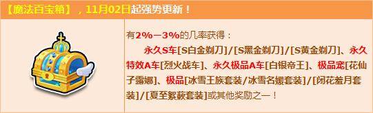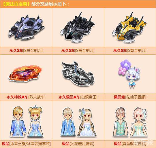 11月2日起,【魔法百宝箱】奖励强势更新,开启有机会得极品永久S车【S白金剃刀】/【S黑金剃刀】/【S黄金剃刀】、永久极品A车【烈火战车】/【白银帝王】、极品宠【花仙子露娜】、极品【冰雪王族/冰雪名媛套装】/【闭月羞花套装】/【夏至絮蔌套装】或其他奖励之一!其中核心奖励期限型概率为:3%-5%,核心奖励永久型概率为2%-3%,非核心奖励概率为:92%-95%。