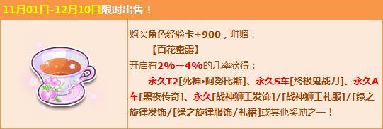 11月1日-12月10日期间,购【角色经验卡+900】,赠送百花蜜露,有机会得永久T2【死神·阿努比斯】、永久S车【终极鬼战刀】、永久A车【黑夜传奇】、永久【战神狮王发饰】/【战神狮王礼服】/【绿之旋律发饰】/【绿之旋律服饰/礼裙】或其他奖励之一!其中核心奖励期限型概率为4%-6%,核心奖励永久型概率为2%-4%,非核心奖励概率为90%-94%。