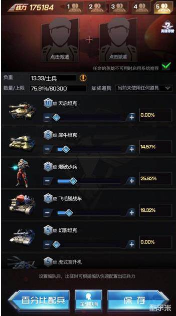 首先是稳健类配兵,以一个五万出征队列的队伍为例子,搭配装甲坦克4000,特种步兵1W6,攻坚战车8000,狙击兵1W2,主战坦克5000,轰炸机5000.这个搭配方法较为稳健,但是缺点是刷野效率会更慢,适合那种几次打都打不下来的野怪,或者玩家们在战力不足情况下,也就是战力不超过野怪情况下,想要越级刷野也可以试试。
