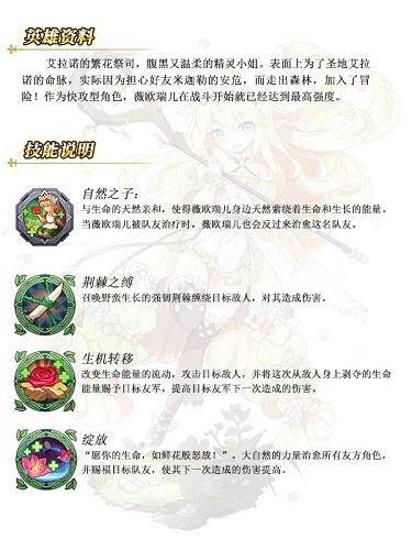 作为艾拉诺的繁花祭司,腹黑又温柔的精灵小姐。表面上为了圣地艾拉诺的命脉,实际因为担心好友米迦勒的安危而走出森林加入冒险!作为快攻型角色,薇欧瑞儿在战斗开始就达到了最高的强度