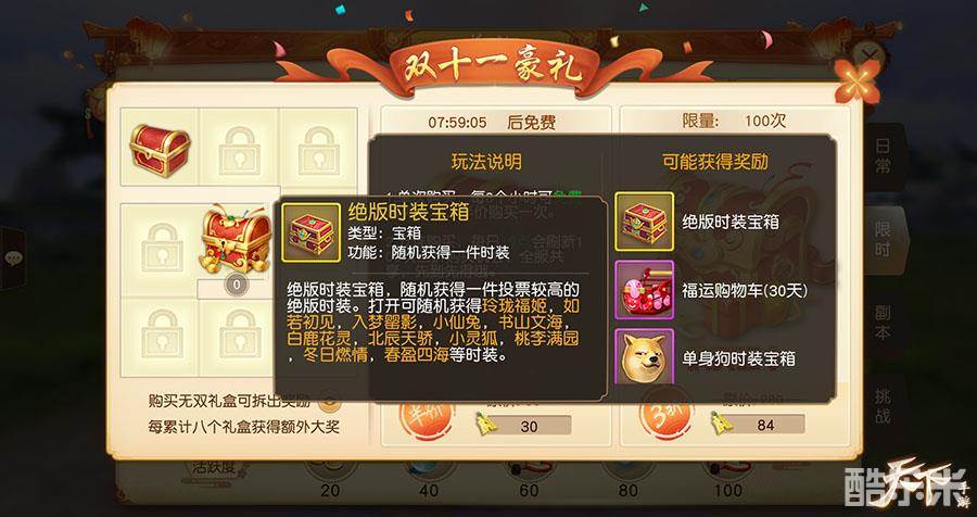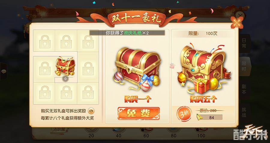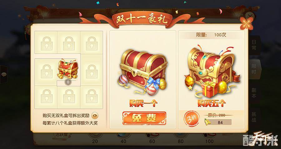 活动期间,每8小时少侠将会有一次免费购买和半价购买机会,千万不要错过噢。每日19点还有三折秒杀活动,不看运气看手速。如果手速不行,一次性购买五个礼盒也有超值折扣,就是这么诚意满满。除此之外每购买八个礼盒还将额外获得馈赠礼盒,这么划算的“双十一豪礼”礼盒你确定不购买吗!