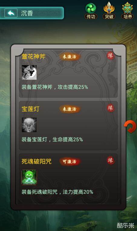 每个卡牌大概都有5个缘分,其中包括一个单人缘、一个多人缘、三个装备/技能缘。以沉香为例,他与三圣母有一个单人缘“母子情深”,也就是说,如果沉香和三圣母同时上阵,这两人的防御力将各自提高20%。沉香还与托塔李天王、哪咤、嫦娥三人有一个多人缘“逍遥仙界”,如果这四人同时上阵,各自攻击力将提高27%。此外沉香还有武器缘“萱花神斧”、饰品缘“宝莲灯”、技能缘“死魂破阳咒”。如果把沉香的缘配齐,他将会有117%的属性加成,相当可观。