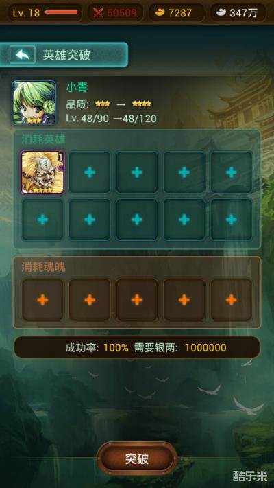 然后是突破。低品质的卡牌可以通过突破升星,变成高品质的卡牌。然后潜力值、成长值和战斗力都上了一个档次。关于成功率,另一篇攻略《如何让突破成功率100%》中有提到,原则上用同品质或高品质的卡牌突破需要的数量少、成功率高。