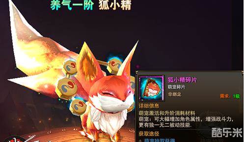 狐小精比前面一些宠物需要的碎片要多一点,需要35个碎片,同时能大幅增加角色属性,增强战斗力,更有独一无二的被动技能!