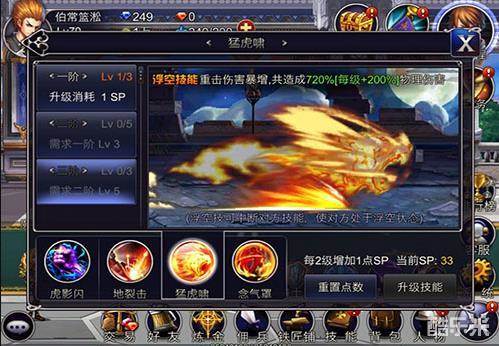 威风凛凛不拘小节的格斗家有着与生俱来的霸气,“猛虎啸”是他的专属技能。“猛虎啸”发动时,只见一只由火焰组成的斑斓猛虎携灭世之力冲向劲敌,受到攻击的敌人便像断线了的风筝一样远远的飞出去,留下满地狼藉。《英雄之剑》最霸气的技能,非“猛虎啸”莫属!
