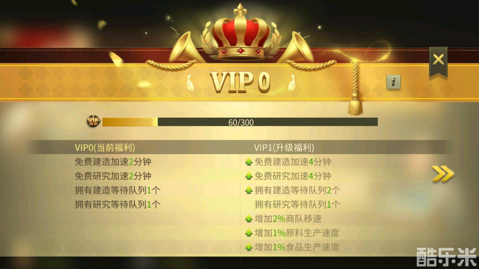 在游戏中,当建筑物的建造时间低于2分钟的时候玩家是可以免费一键完成的,而VIP1将这个时间翻了一番,在4分钟以内都可以一键完成,并且扩充了建造的等待队列。