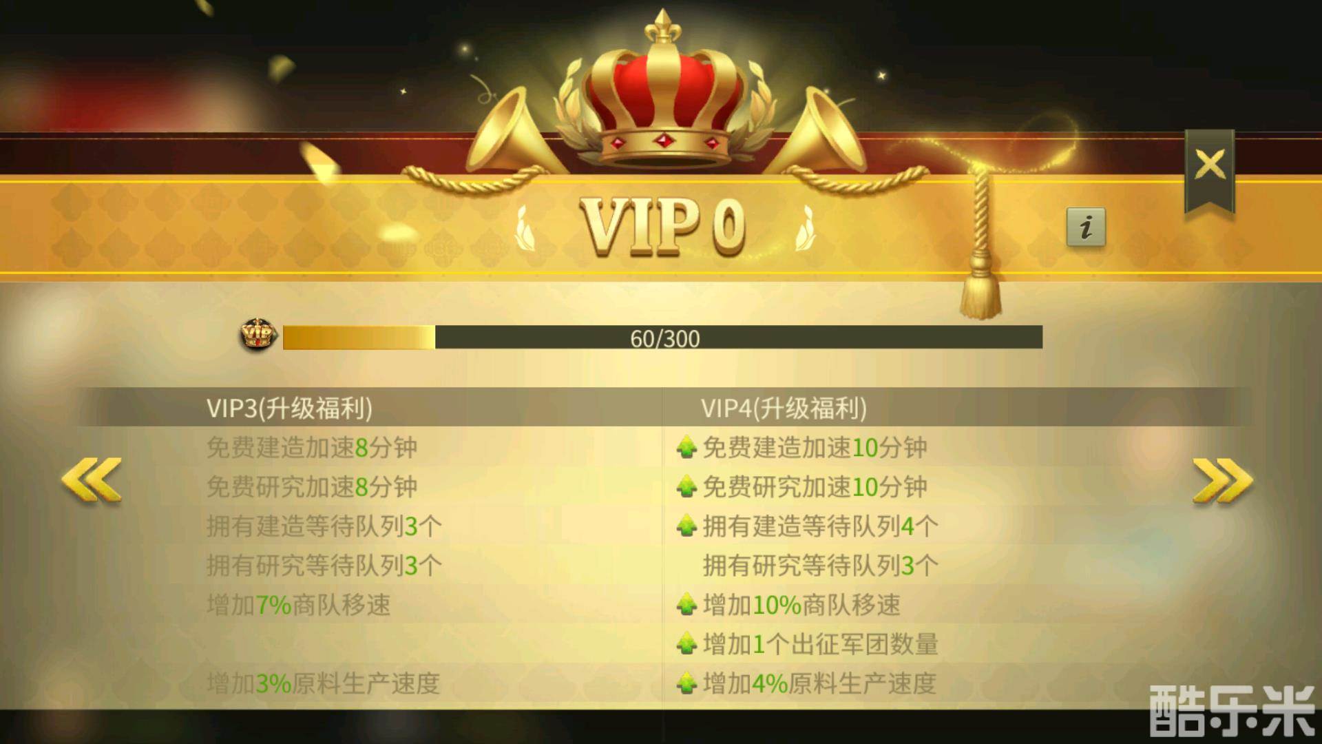到达VIP4,免费建造的时间直接到了10分钟,并且可以等待的队列被扩充到了4个,你完完全全可以点上几个建筑物一觉醒来发现都已经ok了,并且出征军团数量也增加了一个。