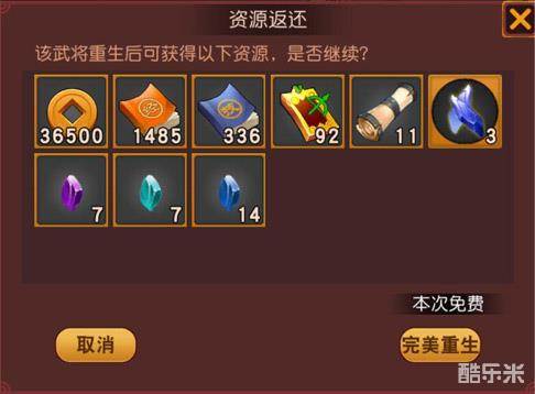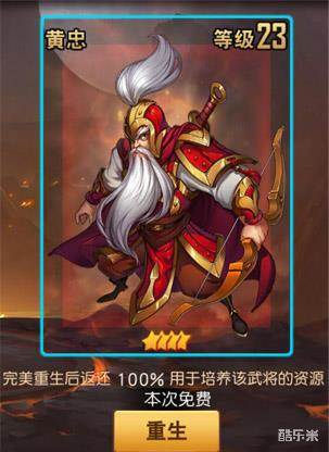 选择一个武将进行重生以后,会返还100%用于培养该武将的资源材料,比如适用于前期的武将到了后期后,作用不是很大,我们就可以把这些武将进行重生,重生后获得的资源材料就可用于培养其他的武将。