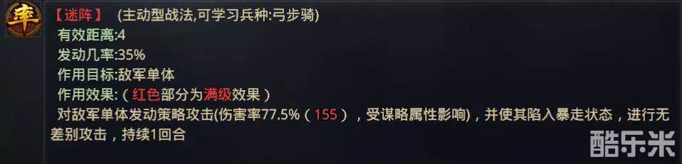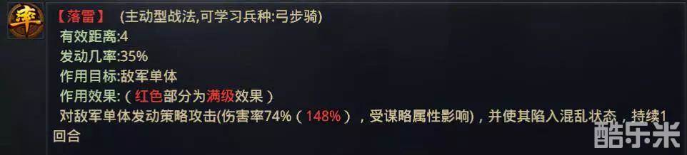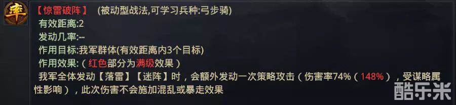 战法解读: 只要是带上【惊雷破阵】的队伍,不管哪个武将发动【落雷】(满级148%)或【迷阵】(满级155%),都会立刻再发动一次随机选择目标的策略攻击(满级148%),也就是说一发【落雷】/【迷阵】可以打2个目标。这个战法可谓天降神技,要优先兑换。