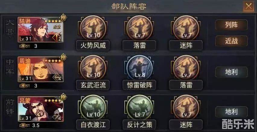 这两个战法有几个优点,首先,这能够构建出极其强大的防御体系,【落雷】、【迷阵】都是35%发动机率的瞬发单控战法,如果4个战法都带上,再加上吕蒙、弓诸葛亮、群貂蝉、十常侍、郭嘉、张春华等这些自带控制的武将,那么对手将面对漫天的混乱、暴走效果,被控得不能自理。