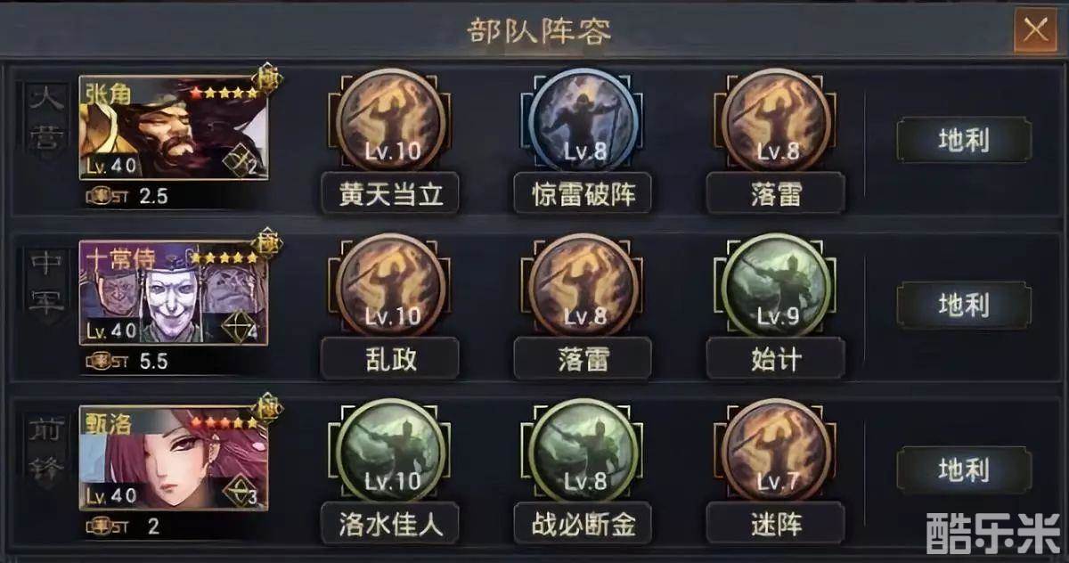 控制效果,保证了本队的生存能力。不过在对阵减伤流时,收益不高,对阵主动战法队时,表现较为理想。本队的【始计】非常重要,在复合控制队伍中,本队的反控能力极为关键。十常侍作为主控手,张角和甄洛补充控制,形成连绵不绝的控制链。
