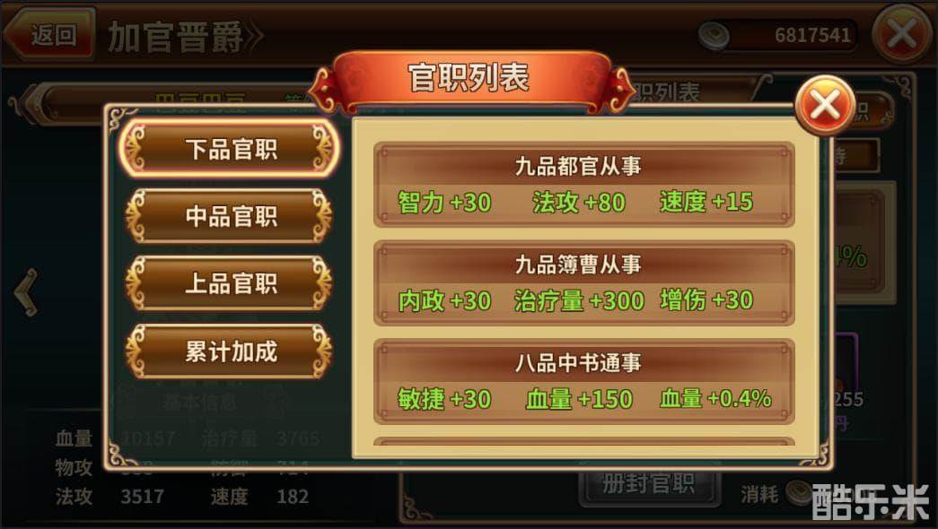 在我们吞食天地的世界里,九品都官从事是最小的官职啦。所有的人想要加官进爵,都要从最小的官职做起,然后踏踏实实,一级一级的往上升。当然了,每一次官职晋升,四圣者都会根据所升官职给予各位穿越者一个属性值的提升。悄悄的告诉大家,大司马是一品职位哦~想当大司马的各位可要抓紧努力呢!