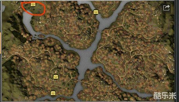 我们通过上图,是看不到河心洲在地图上标识的位置的,如果你对秋日森林这张地图不熟悉的话,很难找到,此时我们只要注意地图左上角,观察下水的位置,没错河心洲就是这里,是不是很简单啊。