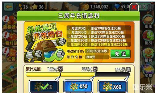 不知不觉《植物大战僵尸2》已经陪伴玩家们三年了,所以特别的充值返利活动也在此时展开。现在充值钻石,不仅将得到更多钻石返利,更可以带走活动限定植物机枪豌豆的碎片。机枪豌豆作为人气植物,一直备受玩家们喜爱,此次借三周年之际将重装回归,再燃豌豆风潮!