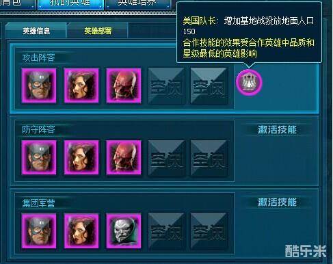 比如美国队长的合作技能,需要和黑寡妇、红骷髅这两个雄都部署在攻击阵容中激活。和其他英雄,或者部署在非攻击阵容时合作技能是不会被激活的哦:)