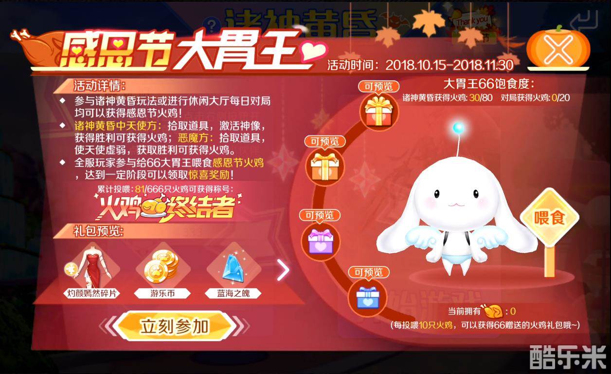 感恩节就要到了,炫舞世界已经开始弥漫着香香的火鸡香味啦~11月15日-30日,只要参加休闲大厅每日对局或参与诸神黄昏都可以获得感恩节火鸡!
