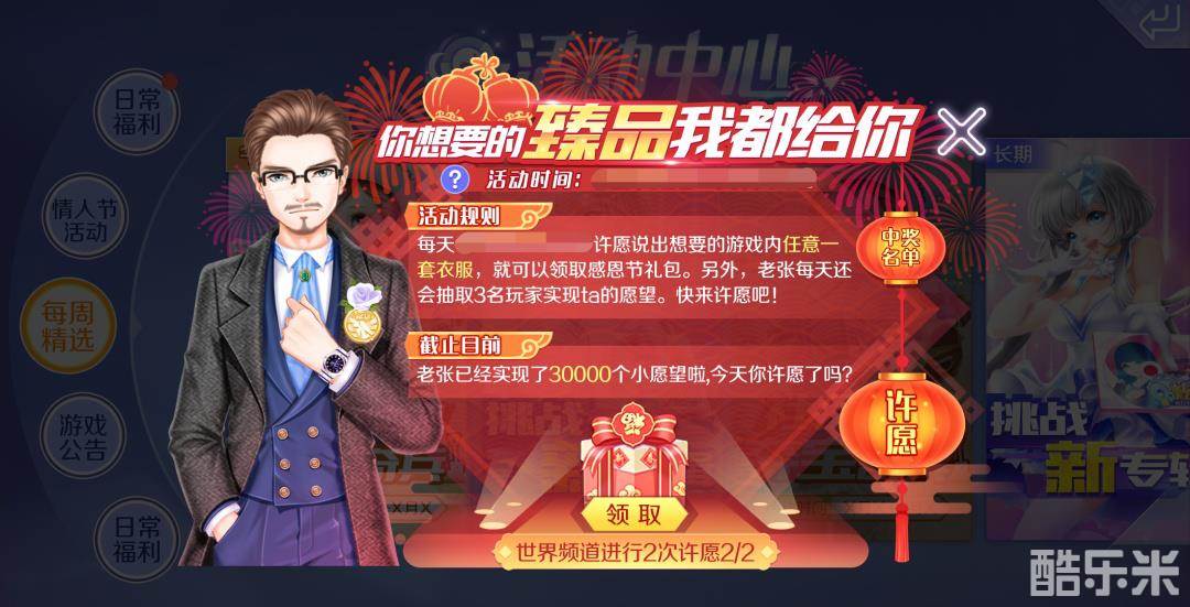 嘿嘿,你们猜这次还有谁也一起来送礼啦?!帅气老张,感恩节在线大放血啦!11月16日-11月25日每天00:00-16:00,在世界频道说出你的愿望,老张就会选择3位小主人来实现你们的愿望(任意一套时装)哦!