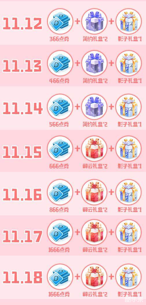 感恩节期间,每日登录游戏还有礼盒送不停~11月12日-18日登录游戏,简约&韶云&影子礼盒全部都送给你们!小主人们记得每日上游戏拿大礼啦~