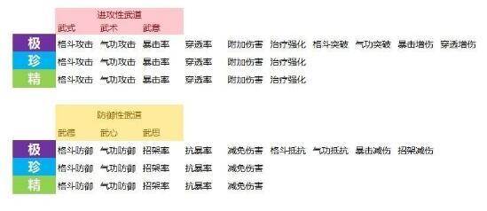 上图为三种品质的武道可能会出现的随机属性整理,本篇内容会根据战士技能特性来推荐一下具体哪些随机属性比较适合,我们以极武道为例。