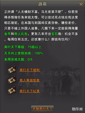 不败传说是一款大型多人在线角色扮演游戏,玩家可以通过粮运商行争取挣钱,加入自己的所属国,并且设有组建家族、帮派、夫妻等多人游戏互动内容,今天小编给大家带来的是不败传说商行天下攻略。