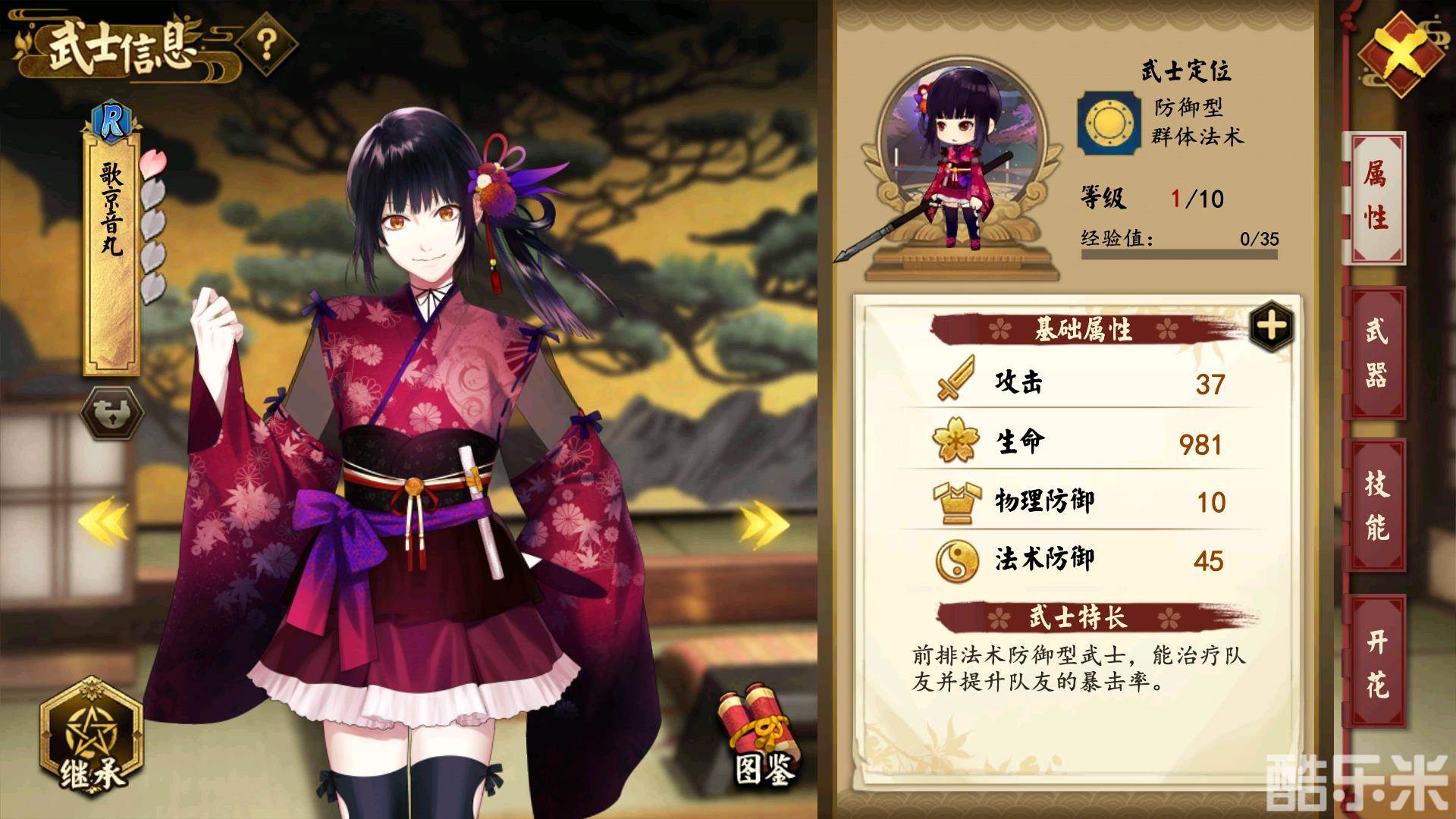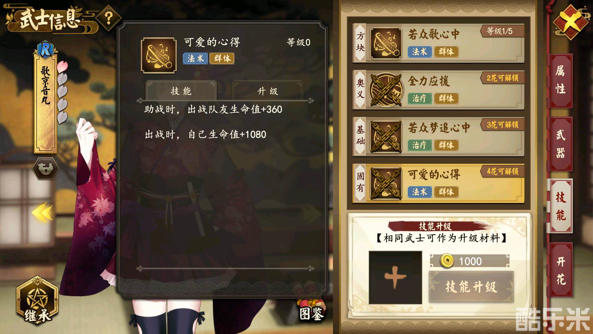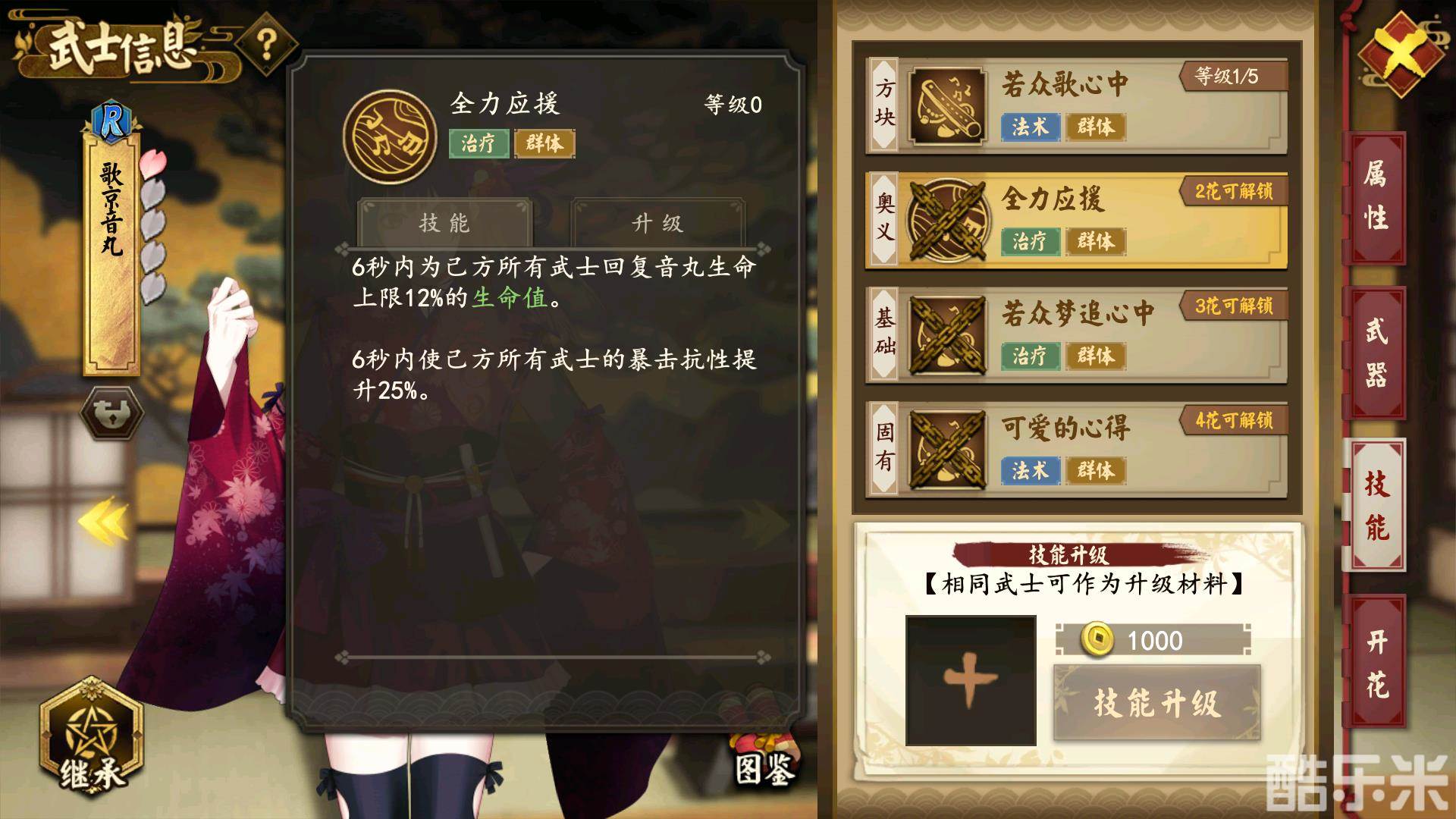 奥义,6秒内己方全体回复歌丸生命上限的百分之12的生命值,并且6秒内提升己方所有武士的暴击抗性百分之26。