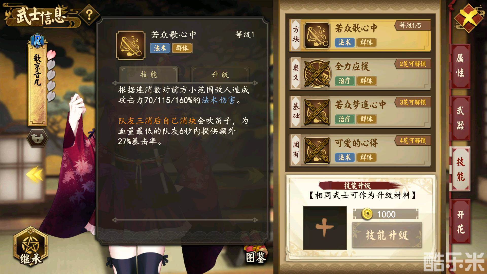 1技能,歌京对前方大概一把武器的距离造成消块数对应的法术伤害,三消能够达到百分之160,这对于一个肉来说已经是很高了。同时在队友三消后自己消块能够吹笛子,让血量最低队友在6s内额外增加百分之27的暴击率。