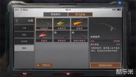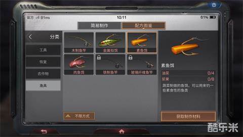 实际上,鱼饵的入手相对简单,即:通过配方合成即可(材料珍稀度一般)。注意,鱼饵分三种,作用各有不同,即金属拟饵、素鱼饵和肉鱼饵。