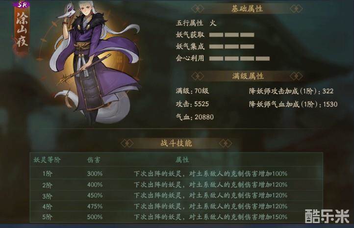 涂山夜虽然只是一个SR妖灵,但是在前期缺少妖灵的情况下,他拥有自己得天独厚的优势,就是他可以跨属性克制战斗。这一切都是因为他的战斗技能,在涂山夜释放妖夜天陨之后,下次出阵的妖灵,对土系攻击伤害提升,最高可到150%。在前期降妖师们缺少木系妖灵,但是又遇到强大的土系BOSS的情况下,涂山夜可以为团队带来大量的输出加成,由于他自身的第三项被动技能,最高可带来40%的攻击加成。