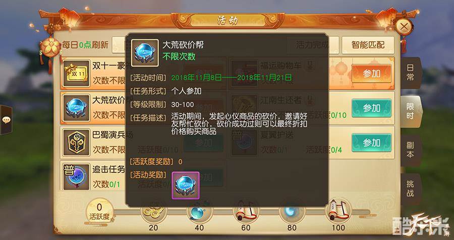叮!少侠,请签收你的天下十周年嘉年华邀请函!双十一过后有点穷,“大荒砍价帮”h5来帮你,这次不用剁手啦!还有“大荒寻宝”活动火热进行中,找到义均氏族人留下的宝藏,再清空一次购物车又何妨!购物之余别忘了参加“双十一签到”,珍贵道具统统免费送!